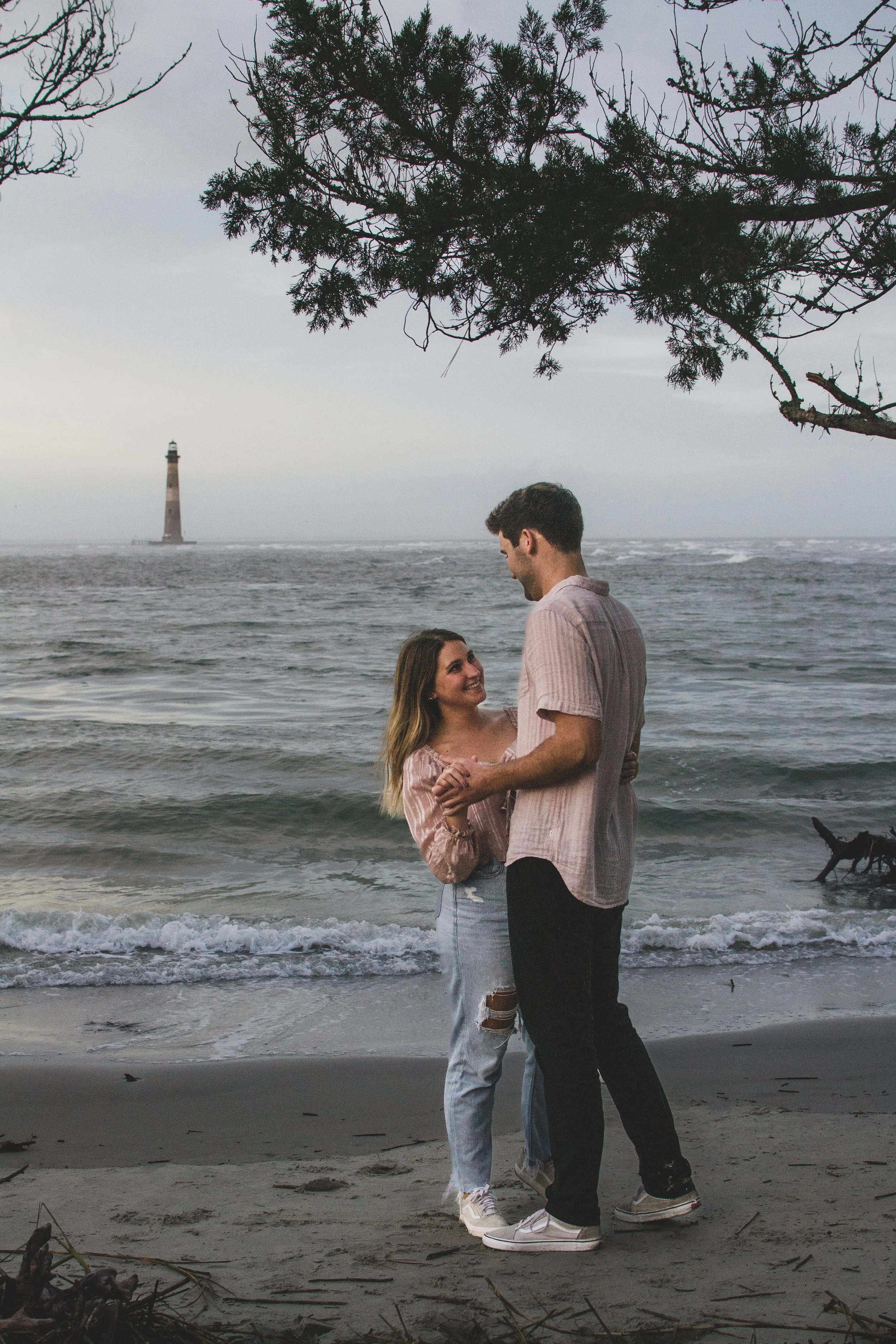 We started the session with a delicious treat on the Folly Beach pier. We kept things moving and made it to a variety of locations on Folly that were meaningful and sentimental for the couple. We made sure to end up at the north end for a lovely sundowner. Jyl was especially into the blurred look of low light movement, so we had some fun at the end of the session playing tag and twirling in front of the lighthouse.
