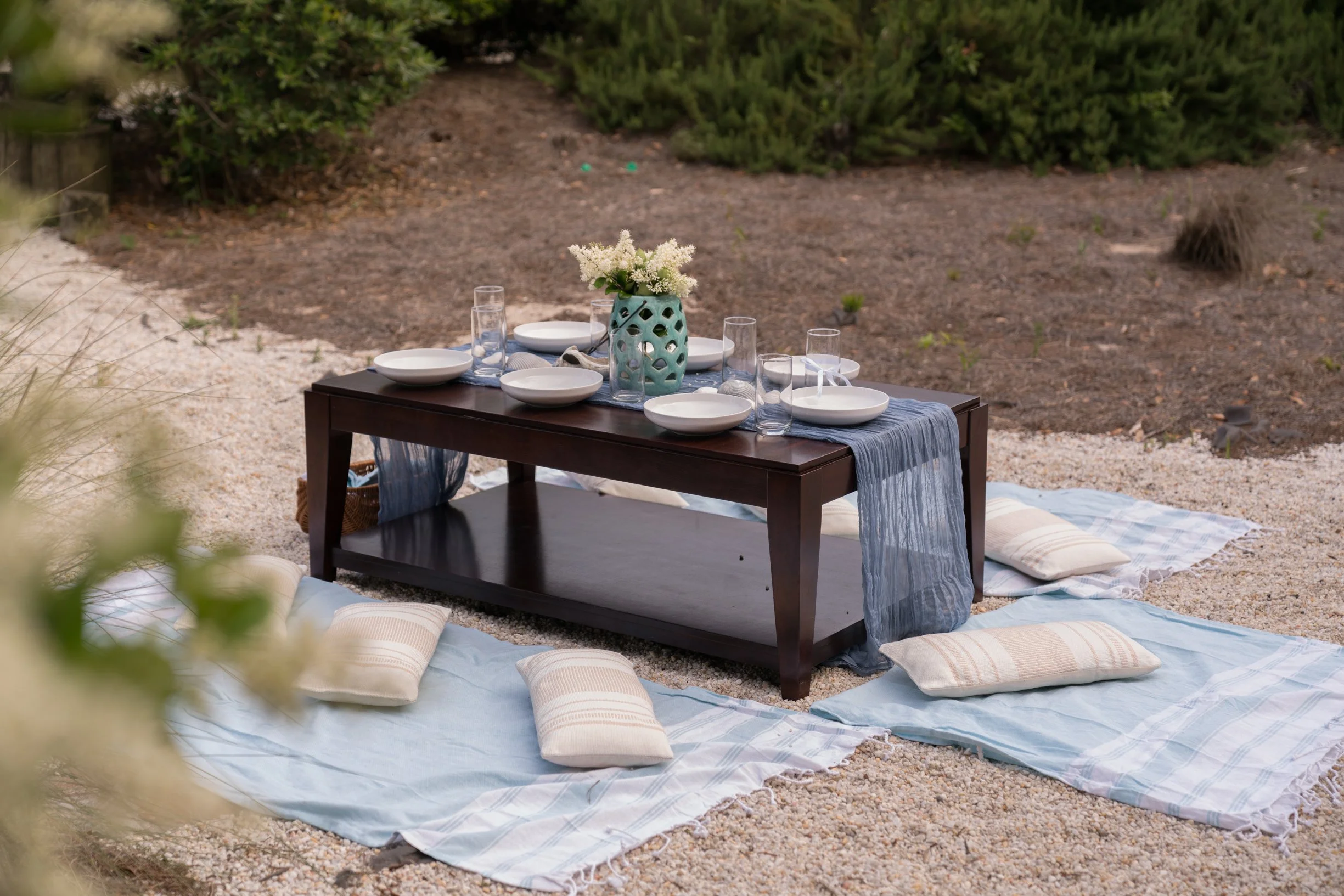 The day of our session ended up being too breezy for a beach picnic, so we decided to move everything to the backyard. The picnic setup featured cute pillow seating, elegant table settings, and a gourmet charcuterie board that added a touch of indulgence to the experience. As the bride-to-be walked outside, her eyes shone with gratitude and the girls’ excitement grew tangible.